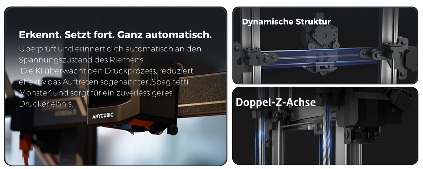 Die Firmware integriert Input-Shaping und Pressure Advance: Gyrosensoren erfassen Mikrovibrationen, die Elektronik gleicht Durchflussänderungen vorab aus und eliminiert Ghosting sowie Ringing. Das Ergebnis sind glatte Oberflächen und scharfe Kanten – selbst bei Höchstgeschwindigkeit.
