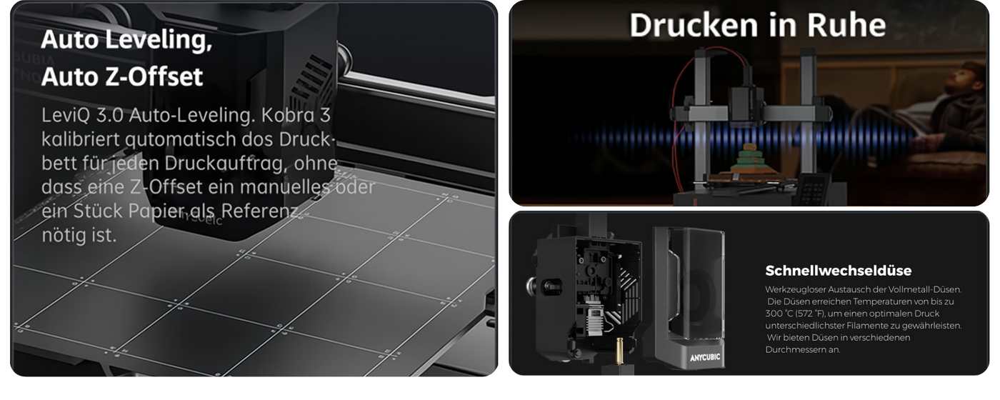 Dank dem High-Speed-Antrieb mit 600 mm/s und einer Beschleunigung von 20 000 mm/s² verkürzt die Kobra 3 die Produktionszeiten von Stunden auf Minuten. Der Direct-Drive-Extruder aus Vollmetall hält bei 300 °C einen konstanten Materialfluss aufrecht, sodass selbst große Bauteile kompakt und frei von Unterextrusion gedruckt werden.